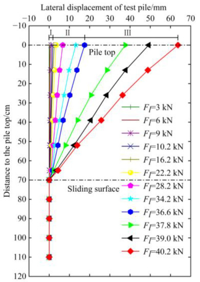 The calculation of in this stage is the same as Equation (30), so the bending moment of the test pile in Stage III is: