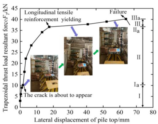Figure 11 illustrates the lateral displacement distribution of the test pile under different trapezoidal load levels, and the ordinate in Figure 12 represents the resultant force (FT) of the concentrated forces F1, F2, F3. The relationship curve between the pile top lateral displacement and the resultant force of trapezoidal load was extracted in Figure 12. It can be seen that the pile lateral displacement increased linearly along the pile length as trapezoidal load increases, and the deformation process of the cantilever anti-slide pile included three stages. In Stage I, the pile lateral displacement increased approximately proportionally with the resultant force of the trapezoidal thrust load (FT), but the rate of increase was relatively slow. In this stage, the cantilever anti-slide pile worked in full section, and the concrete and the steel bars in the tension area bore the tensile force together, both of which were in an elastic stage. When FT increased to 10.2 kN, the maximum lateral displacement at pile top was 1.75 mm, and the tensile area near the sliding surface of side A of the test pile first cracked (Figure 12 and Figure 13a), which was named as the uncracked stage of the cantilever anti-slide pile. In Stage Ⅱ, due to the concrete cracking in the tension area, the tensile force originally born by the concrete was gradually transferred to the tensile steel bars, and the cracks on side A, side B, and side D of the test pile gradually expanded and extended (Figure 12 and Figure 13b,d). As the trapezoidal load increased, the tensile force at the cracking area was basically born by the tensile steel bars. In this stage, the lateral displacement of the pile increases more obviously due to the presence of cracks, and the lateral displacement at pile top increases in a non-proportional manner with FT. When FT increased to 36.6 kN, the maximum lateral displacement at pile top was 17.5 mm, and the tensile steel bars began to yield. Since then, the maximum lateral displacement at the pile top increased sharply, which was named as the crack emerging and developing stage of cantilever anti-slide pile. In Stage III, when FT gradually increased to 40.2 kN, the concrete strain in the compression area reached the ultimate compressive strain, and the concrete in the compression area crushed and bulged (Figure 12 and Figure 13c). The trapezoidal thrust load gradually rebounded, the maximum lateral displacement at pile top was 63.7 mm, and the anti-slide pile subsequently failed (Figure 12 and Figure 13e), which was named as the steel bar yielding-failing stage of cantilever anti-slide pile.
