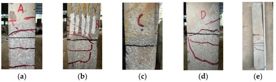 Crack distributions along the test pile. (a) Side A; (b) Side B; (c) Side C; (d) Side D; (e) Pile.