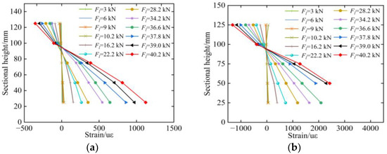 Figure 14 illustrates the strain distributions along different heights of concrete in side B of test pile under various loads. Due to the wide crack after the cracking of the anti-slide pile section, some strains on the CSG-2 row could not be accurately collected. The conclusion could be drawn that the concrete strains at different heights of two sections of the test pile were basically proportional to the distances from the points to the neutral axis when the load was fixed, and the concrete strains were linear, which indicated that the plane section assumption was available.