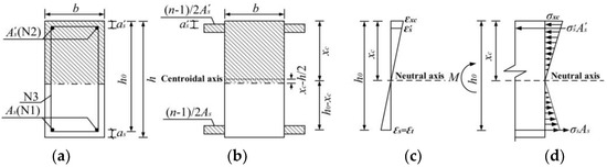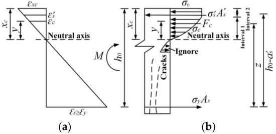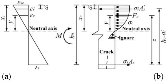 The calculation method of the bending moment of the pile in Stage II is introduced as follows. Firstly, based on the plane section assumption, the concrete strain at () and the concrete strain with a distance y from the neutral axis () are determined as follows:
