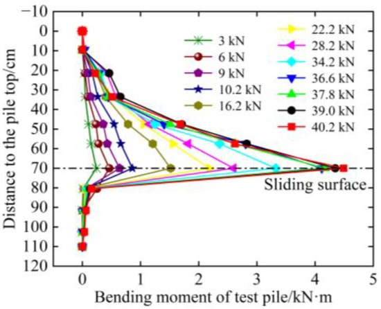 According to the optimized calculation method for the bending moment of the cantilever anti-slide pile proposed in this paper, the bending moment distribution of the test pile in the loading process of the trapezoidal load was obtained, as shown in Figure 20. It is obvious that the pile bending moment increased gradually with the trapezoidal load, increasing first and then decreased gradually along the pile length. The maximum bending moment was located at the sliding surface, and the farther away from the sliding surface, the faster the attenuation. At the same time, the evolution process of the pile bending moment mainly included three stages. When the resultant force of the trapezoidal thrust load (FT) was less than the pile cracking load, the maximum bending moment gradually increased, and increased to 0.86 kN·m. When FT reached 10.2 kN, subsequently, the test pile entered the working stage with cracks, and the pile bending moment increased rapidly. When FT increased to 36.6 kN, the maximum bending moment was about 4.16 kN·m. When the steel bars yielded, the external trapezoidal load behind the test pile remained basically unchanged, the test pile tended to be damaged, and the maximum bending moment increased slowly to 4.49 kN·m when the test pile was destroyed.