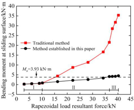 Equation (8) in Section 3.2.1 was used to calculate the pile bending moment at the sliding surface, and further compared with the optimized calculation method established in Section 3.2.2, and the comparison results are represented in Figure 21. It can be found that the two are basically the same when the test pile worked in the elastic stage (Stage I). The maximum bending moment at the sliding surface obtained by using the optimized calculation method established in Section 3.2.2 (Equation (20)) is slightly larger. The reason was that the increasing effect of tensile steel bars and compressive steel bars on the inertia moment of pile section was considered in Equation (20), resulting in the calculation result of the inertia moment of pile section larger than that of Equation (8). When the test pile worked in the stage of crack emerging and developing (Stage II), the gap between the two grew gradually with the trapezoidal load. The reason was that the anti-slide pile in stage II was regarded as an elastoplastic body in the optimized calculation method built in this paper (Equation (31)), and the elastoplastic characteristics of compressive concrete were considered. The pile compressive concrete was treated as a linear elastomer during the whole loading process in the traditional method (Equation (8)), resulting in a larger calculation value of bending moment. When the values of FT were 16.2 kN and 36.6 kN, respectively, the bending moments calculated by the traditional method (Equation (8)) were 2.87 times and 5.24 times the bending moment obtained by the optimized calculation method established in Section 3.2.2 (Equation (31)). Moreover, the theoretical ultimate flexural bearing capacity of the test pile(Mu) was 3.93 kN·m according to the flexural strength formula of reinforced concrete beam, which is not much different from the maximum bending moment obtained by the optimized calculation method established in this paper (Equation (35)). The bending moment at the sliding surface of the test pile calculated by the traditional method was as high as 35.37 kN·m, which is obviously inconsistent with the fact.