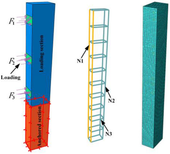 Three-dimensional numerical nonlinear analysis and parameter analysis of model anti-slide pile were carried out by using ABAQUS numerical simulation software. The model size, external trapezoidal load, and main parameters of the model pile are the same as those in Section 2. The FE model was constructed by embedded element technology, and the damage plasticity model (CDP model) was adopted for the pile concrete, which are defined according to the plasticity and damage parameters. The double broken line model of isotropic plasticity was applied for the constitutive relation of pile steel bars. The boundary conditions of the numerical model mainly set the anchored section as a fixed constraint and the loaded section as a free boundary. The C3D8R element and the T3D2 element were adopted for the pile concrete and steel bars, respectively, and the numerical model was divided into 17,164 elements and 20,134 nodes, as shown in Figure 22.