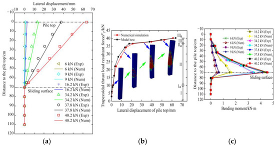 Comparison of the experimental and numerical simulation results. (a) Displacement; (b) thrust load-pile top displacement; (c) distribution of bending moment.