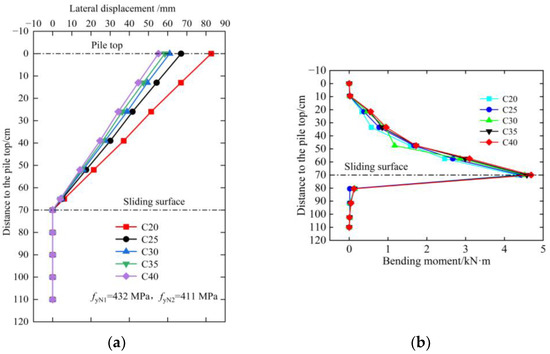 Variations of the pile displacement and bending moment with respect to concrete strength. (a) Pile displacement; (b) pile bending moment.