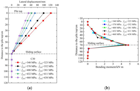 Variations of the pile displacement and bending moment with respect to steel bars’ strength. (a) Pile displacement; (b) pile bending moment.