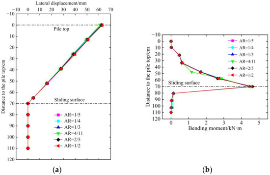 The anchor ratio (AR) is another crucial parameter for the structural design of a cantilever anti-slide pile. Figure 26 shows the distributions of the pile displacement and bending moment under five anchor ratios (1/5, 1/4, 1/3, 4/11, 2/5, 1/2). It can be concluded that the pile displacement and bending moment under different anchor ratios changed little. The reason is that the anchored section was set as a fixed constraint in the ABAQUS numerical simulation to simulate the anchored section, indicating that when the strength of the rock formation embedded in the pile anchored section is large enough, blindly increasing the length of the pile anchored section cannot significantly improve the bearing capacity, which is in agreement with the results by [26]. In summary, the length of pile anchored section should be designed reasonably by combining economic factors and safety factors in this case.