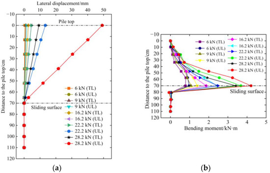 The lateral displacement and bending moment of the cantilever anti-slide pile under the trapezoidal load (TL) and uniform load (UL) were further compared, as shown in Figure 27. When the resultant force of the trapezoidal load (FT) reached 6 kN, the lateral displacements at the pile top under the trapezoidal load and uniform load were 0.47 mm and 0.9 mm, respectively, and the maximum bending moments at the sliding surface were 0.78 kN·m and 0.97 kN·m, respectively. When Fl reached 28.2 kN, the lateral displacements at pile top under the trapezoidal load and uniform load were 9.3 mm and 49.15 mm, respectively, and the maximum bending moments were 3.42 kN·m and 4.21 kN·m, respectively. This shows that the lateral displacement and bending moment of the anti-slide pile under the uniform load and trapezoidal load have little difference when the external thrust load is small. As the external thrust load increases, the lateral displacement and bending moment of the anti-slide pile under the uniform load are gradually larger than those under the trapezoidal load, especially the lateral displacement, and the gaps under the two loads gradually increase with the external thrust load. In summary, the distribution form of the external thrust load behind the cantilever anti-slide pile will significantly affect its stress and deformation. In the process of the structural design of the cantilever anti-slide pile, the distribution form of the external thrust load should be judged as accurately as possible to make it more consistent with the actual stress distribution, so as to make the structural design of the anti-slide pile more reasonable and economical.