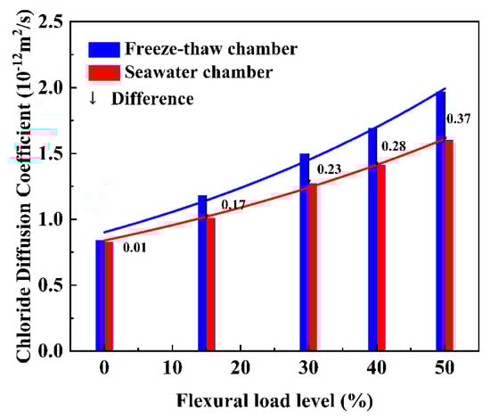 The results of the chloride diffusion coefficient from the seawater simulation test chamber and the freezing and thawing test chamber for the concrete specimens under flexural load were compared, as shown in Figure 4.