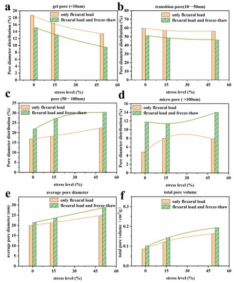 It can be seen from Figure 5a,b that the gel pores and transition pores decrease with the increase in the pressure level. The harmful pores and micropores tend to increase with the increase in stress levels from Figure 5c,d. Compared with the pore structure under the same stress level in different test environments, the total pore volume and average pore diameter of concrete under flexural load and freeze–thaw are higher than that under flexural load only. On the contrary, the proportion of gel pores and transition pores is lower than that under flexural load only. It has been shown that the influence of flexural load and freeze–thaw on the pore structure of concrete is higher than that under flexural load only.