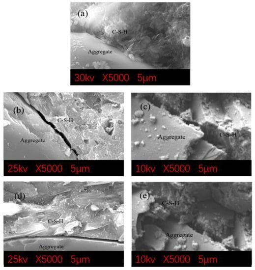 As shown in Figure 6, the interface between the aggregate and the paste of concrete under no load is dense, and no obvious pores or cracks can be observed in Figure 6a. Under the flexural load, the interface between the aggregate and the paste produces cracks, and the width of the crack of concrete under a 30% stress level is bigger than that under a 15% stress level in Figure 6b,d, or in Figure 6c,e. By comparing Figure 6b,c, or Figure 6d,e, it can be seen that under the same stress level, the width of a crack in the interface transition zone of concrete under flexural load and freezing–thawing is greater than that under flexural load only. It can be seen that the coupling action of flexural load and freezing–thawing on the microstructure of concrete is greater than that under flexural load only at the same stress level.