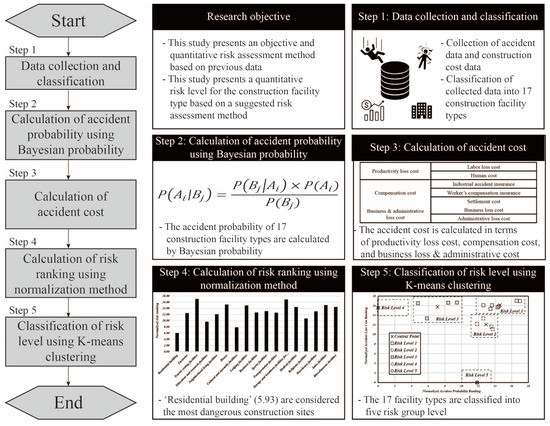 This study involved the following five steps: (1) data collection and classification; (2) calculation of accident probability using Bayesian probability; (3) calculation of accident cost; (4) calculation of risk ranking using normalization method; and (5) classification of risk level using k-means clustering.