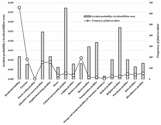 As seen in Figure 2, “residential buildings” were found to be the most dangerous facility type in terms of the frequency of accidents but ranked seventh among the 17 facility types in accident probability. However, “Cultural and assembly facilities,” which were found to be the most dangerous facility type in terms of accident probability, ranked sixth among the 17 facility types in terms of accident frequency.