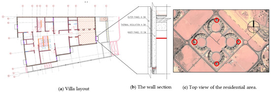 Location of an experimental study in Qassim University, (a) Villa layout, (b) The wall section, (c) Top view of the residential area.