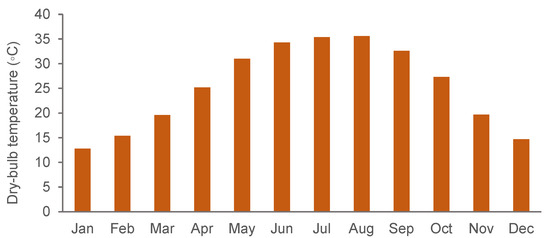 The area identified for undertaking the study was faculty housing at Qassim University, consisting of consists of 288 residential villas of similar design, illustrated in Figure 2. The geometric layout of the villas provided an opportunity to investigate various factors affecting their thermal performance. The climate of the Qassim Region is generally hot and dry with wide temperature variations ranging from 46 °C (July) to below freezing during winter (nights) (Figure 3). The significant seasonal temperature variation is accompanied by high intensity of solar radiation due to clear skies and low cloud cover—approximately 1000 watts/m² h (General Authority of Meteorology and Environmental Protection (GAMEP), 2016) which increases the severity of environmental conditions.
