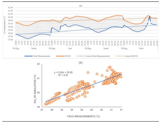 Figure 5a,b presents the relationship between the simulated indoor air temperature results and the collected field measurement as a line chart and scatter plot, illustrating a positive correlation (R² = 0.81) between them. This substantially validates the robustness of the model used, as well as the selection of the variable of interest to drive the simulation model. While considering the four main orientations, north, east, south, and west, 48 parametric simulations were undertaken to examine the impact of four wall insulation materials (XPS, GW, EPS, and RW with different thicknesses) on the building’s energy performance.