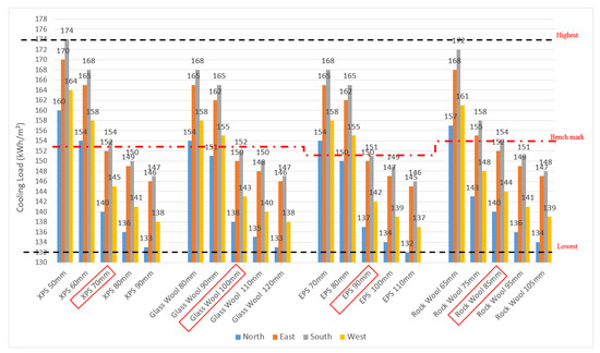 The simulation results in Table 4 also present the impact of orientation on the cooling loads, as illustrated in Figure 9. EPS 110 mm imposes the lowest cooling loads out of all materials, while XPS 50 mm sets the highest cooling loads compared to the other materials. It can also be interpreted that materials with different thicknesses could be logically allocated to specific orientations to achieve an optimum cooling load. E.g., XPS 70 mm, GW 100 mm, GW 90 mm, EPS 90 mm, EPS 80 mm, RW 85 mm, and RW 75 mm, could all be applied to the north and west orientations, while the recommended SBC thicknesses could be applied to the east and south orientations. The manipulation of different thicknesses and their allocation to a specific orientation façade could significantly reduce cooling loads. Hence, the impact of insulation materials and their thicknesses, in conjunction with building orientation, should be considered to evaluate the cooling load instead of applying the recommended thickness of insulation materials.