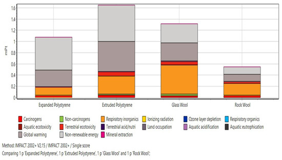 The reasons for the significant differences in these values are the material composition and manufacturing processes used. For example, XPS presents the highest GWP due to use of the use of harmful gases and their condensation inside the insulation body during its manufacture, as compared to EPS, with fewer emissions than XPS due to the use of water vapor instead of harmful gases in the manufacturing processes, as evidenced from literature.