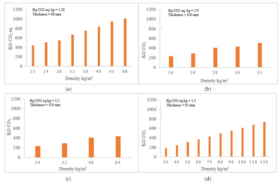 As seen in Figure 12a, emissions from the manufacture of XPS of 21 kg/m3 to insulate the room of 49.8 m2 wall area with the SBC specified thickness (80 mm) showed the least value of 442 Kg CO2 eq, while it showed the highest value of 1010 of Kg CO2 eq with a density of 48 kg/m3, a variation of 129% over the minimum value. In Figure 12b, the GWP of EPS for the room considered with the SBC specified thickness of 100 mm demonstrated a minimum value of 231.1 Kg CO2 eq at a density of 16 kg/m3, while a density of 35 kg/m3 demonstrated GWP of 505 Kg CO2 eq, a difference of 119%. In Figure 12c, the SBC’s recommended thickness of 110 mm demonstrates the least GWP of 420.7 Kg CO2 eq at a density of 24 kg/m3 and the highest GWP of 1122 Kg CO2 eq for a density of 64 kg/m3. For manufacturers of RW, Figure 12d demonstrates the highest GWP of 738 Kg CO2 eq at a density of 120 kg/m³, while a density of 30 kg/m³ demonstrates the minimum GWP of 185 Kg CO2 eq. Overall, RW demonstrated the lowest GWP out of the four materials considered for the study. Figure 13 illustrates the effect of density on GWP in terms of Kg CO2 eq for each material, which evidences the significance of this parameter in the application of insulation in buildings.