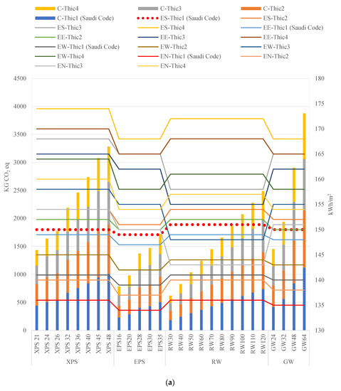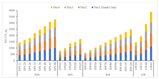 After the energy analysis, all scenarios within the range of SBC limitations were compared based on carbon dioxide emissions for the selected insulation materials (Table 4), by selecting the governing function as “comparison” using the IMPACT 2002+ methodology and database. The present study highlights options with less thickness that can be adopted with less cooling load and carbon emission.