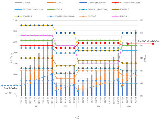 The thermal performance analysis of the four orientations according to the requirements of the SBC showed a variation in the cooling loads, with the highest cooling loads along the southward orientation. Considering this as a reference, Figure 14a shows the differences up to 2.0 cm among other orientations. Figure 14b illustrates a combination of different types of insulation and thicknesses of the specified SBC range (dotted line). For instance, the western façade of the minimum insulation thickness (the lowest in the study) achieved the acceptable code limit in RW materials. For the GW, XPS, and EPS, it exceeded the required limit in the SBC code. Hence, the SBC code can be achieved with the minimum thickness of the RW. The north and west orientations could use XPS 70 mm, GW 100 mm, GW 90 mm, EPS 90 mm, EPS 80 mm, RW 85 mm, and RW 75 mm, while the east and south orientations could use the recommended SBC code thicknesses. Manipulating different thicknesses and their allocation to specific orientation can potentially result in significant cooling load reduction. As a consequence, in order to assess the cooling loads imposed by different material thicknesses for different orientations, instead of relying exclusively on a thickness specified by the SBC, it would be best to evaluate the cooling loads imposed by differing thicknesses.