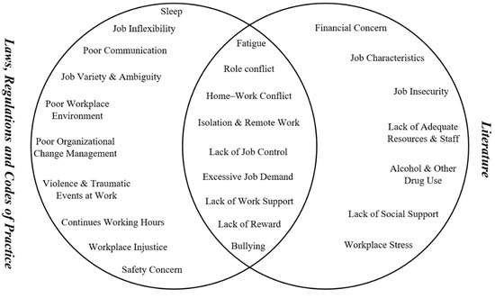 Bringing this analysis together, Figure 3 and Figure 4 graphically summarize the areas of focus, overlap (agreement), and divergence (disagreement) of the retrieved literature and the selected laws, regulations, and codes of practice towards mental health risk factors and mental health risk assessment methods, respectively.