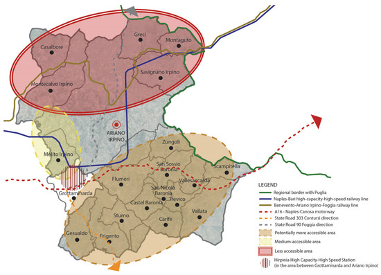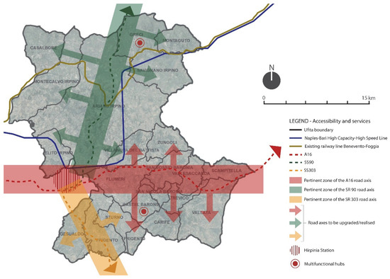 The goal “Improving the accessibility of the territory”, in view of the previous considerations, has been divided into three sub-goals: improving physical accessibility; improving digital accessibility; setting up integrated mobility systems. In particular, it is considered a priority to strengthen the existing main infrastructures (A16, SR90, SR303) and to reinforce and/or construct secondary roads to connect the more distant municipalities to the three primary routes.