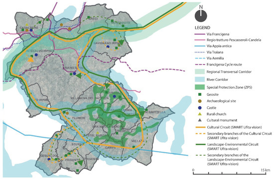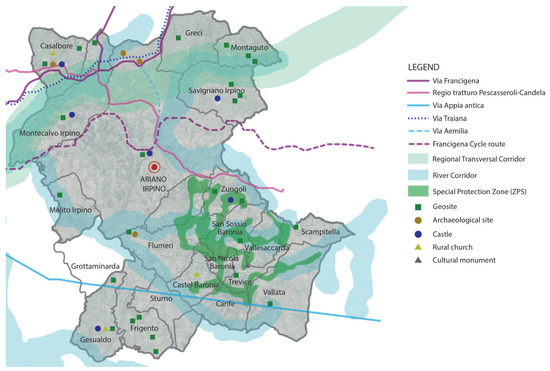 Figure 7), potential strategic elements for a territorial reconnection, also in terms of tourism and culture. Moreover, in this area, as reported in the Provincial Coordination Territorial Plan (PTCP) of the Avellino Province, there is a transversal regional ecological corridor and many linear elements also of ecological interest (see