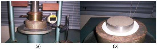 The compaction was statically performed in a compression press with a capacity of 50 kN. The soil volume, previously calculated, was placed in the ring and embedded in the compaction mold. The shape of the mold ensured that the soil was not compacted further than necessary, due to the safety system at the top, where there is a contact of the piston with the top of the mold, preventing the piston from further compacting the soil (see Figure 3).
