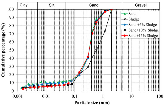 Soil mixtures with sewage sludge in proportions of 5% and 10% are classified, also as silty sand (SM), non-liquid, and non-plastic. The soil–sludge mixture with 15% of sludge is classified as poorly graded silty sand (SM-SP), non-liquid, and non-plastic. In the TRB classification system, the mixtures with percentages of sludge of 5% and 15% are classified as boulders and silts or clays sands (A-2-4), and the mixture with 10% is a fine sand (A-3).