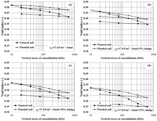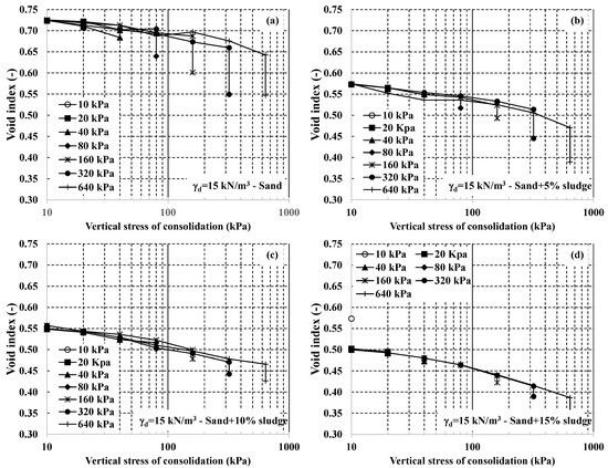 Variation of the void index with the vertical stress of consolidation obtained through double oedometer tests, for dry apparent specific weight of 15.0 kN/m3: (a) sand, (b) sand plus 5% sewage sludge, (c) sand plus 10% sludge, (d) sand plus 15% sludge.