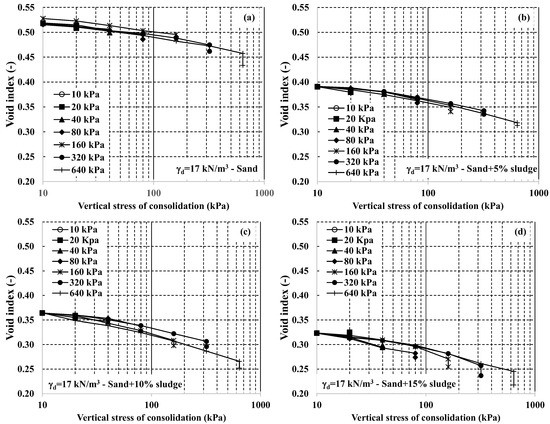 Variation of the void index with the vertical stress of consolidation obtained through double oedometer tests, for dry apparent specific weight of 17.0 kN/m3: (a) sand, (b) sand plus 5% sewage sludge, (c) sand plus 10% sludge, (d) sand plus 15% sludge.