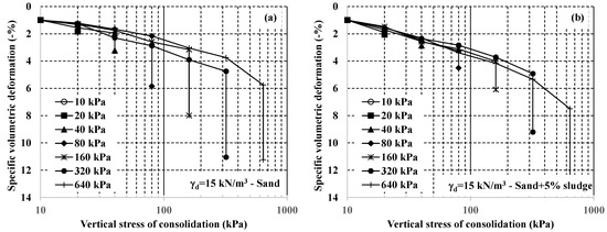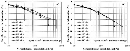 Variation of specific volumetric deformation with the vertical consolidation stress obtained through single oedometer tests, for dry apparent specific weight of 15.0 kN/m3: (a) sand, (b) sand plus 5% sewage sludge, (c) sand plus 10% sludge, (d) sand plus 15% sludge.