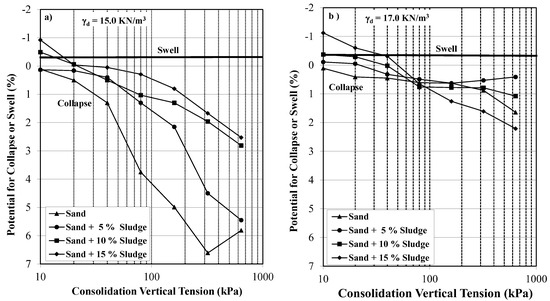 It should be emphasized that the increase in the sludge content, for the same specific dry weight of the soil–sludge mixture, leads to a decrease in the void content of the soil, which justifies lower collapsibility, i.e., improves the collapsibility of the soils.