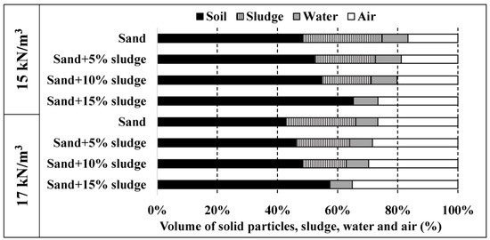 Figure 11 shows, for the dry apparent specific weights of 15.0 kN/m3 and 17.00 kN/m3, the average values, in volume, of each component of the mixtures that was analyzed. It was possible to observe, that for the same dry apparent specific weight, the addition of sludge increased the volume of solid particles and decreased the volume of voids, due to the reduction in the air volume.