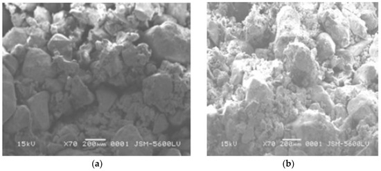 Electron microscopy of (a) natural soil—packaging, and (b) soil–sludge mixture—Quartz grains bonded with silts, clays, and soil–sludge organic matter.