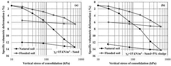 Finally, double oedometer tests were carried out with soil and soil–sludge mixtures compacted with a dry specific weight of 15.0 kN/m3 and 17.0 kN/m3. Figure 13, Figure 14, Figure 15 and Figure 16 present the void index versus the vertical consolidation stress, and the specific volumetric strain versus the vertical consolidation stress, obtained in tests on soil samples in natural (constant) and flooded soils (using distilled water as flood liquid).