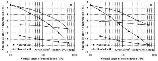 Variation of specific volumetric deformation with the vertical consolidation stress obtained through double oedometer tests, for dry apparent specific weight of 15.0 kN/m3: (a) sand, (b) sand plus 5% sewage sludge, (c) sand plus 10% sludge, (d) sand plus 15% sludge.