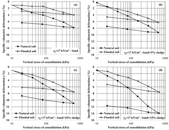 Variation of specific volumetric deformation with the vertical consolidation stress obtained through double oedometer tests, for dry apparent specific weight of 17.0 kN/m3: (a) sand, (b) sand plus 5% sewage sludge, (c) sand plus 10% sludge, (d) sand plus 15% sludge.
