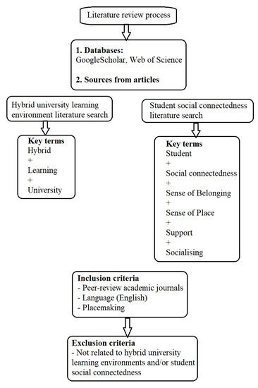 A search for academic-level empirical studies in the English language was made on Google Scholar and Web of Science using three main keywords: ‘student social connectedness’, ‘hybrid university learning environment’, and ‘placemaking’. These were combined with deviations from the subsequent keywords: socialising, social support, sense of belonging, and sense of place. The search focuses on the period from 2002 to 2022 to allow for technological developments and changes to the learning environment over the last 20 years. However, emphasis was placed on studies following 2020, to account for the COVID-19 pandemic and the extreme changes that emerged during this time. The inclusion criteria thus requires that studies are (1) reported in English; (2) published in peer-reviewed journals, for the assurance of quality; and (3) published between the years 2002 and 2022. Exclusion criteria included studies not related to the HULE, the university, or student social connectedness. Figure 2 illustrates the process of this search methodology.