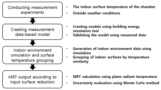 This study investigates the uncertainty of indoor MRT derived according to the indoor surface temperature grouping for a specific case. This study also analyzes the effect of the uncertainty of indoor thermal comfort. The input data for the MRT calculation are generated through a simulation model, and the Monte Carlo method is used to investigate the uncertainty. The overall research flow proceeds, as shown in Figure 1.