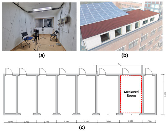 The experiment to measure the indoor surface temperature was conducted for 8 days from May 4 to May 12 in a test facility located at Hanbat National University (Republic of Korea, Daejeon, latitude: 36.35, longitude: 127.30). Figure 2 shows a photograph and plan view of the test facility where the measurement experiment is conducted. The interior size of the test facility is 5.5 m × 2.4 m × 2.3 m (length × width × height), and a window (2.0 m × 1.0 m) is located on the south wall at 0.8 m from the floor. The south and roof surfaces are exposed to the outside air, and the remaining surfaces are in contact with the adjacent zone. The roof has a 5-degree slope. The facility envelope is composed of SIP (Structural Insulated Panels) with a thickness of 220 mm, and the thermal transmittance is 0.17 W/m2K. The window on the south side is a fixed window made of triple glazing (6 mm Clear, 6 mm LowE, 6 mm LowE) and the thermal transmittance is 1.44 W/m2K.