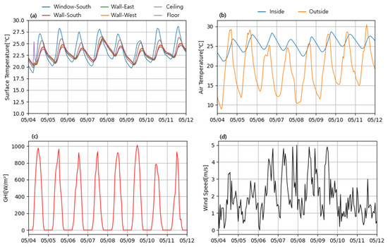 External meteorological data (e.g., external temperature and global horizontal irradiance) is also measured with 10 min of time-step. The outside temperature varied from 8.9 °C to 30.5 °C, the global horizontal irradiance was up to 1011 W/m2, and the outside weather was mostly sunny during the experimental period. During the measurement period, the indoor thermal condition of the chamber was kept without the heating and cooling controls. As a result of the measurement, the indoor air temperature ranged from a minimum of 21.1 °C to a maximum of 28.6 °C due to the change in outdoor temperature and the influence of solar radiation, and the average daily temperature difference was 4.2 °C. In the case of indoor surface temperature, the average daily temperature difference of opaque surfaces such as walls and floors was 3.3 °C, but the average daily temperature difference between windows and doors was 7.1 °C, showing a relatively large range of changes. Figure 3 is a graph showing the measured indoor surface temperature and external weather conditions. The measuring instruments used in the measurement experiment are shown in Table 1.