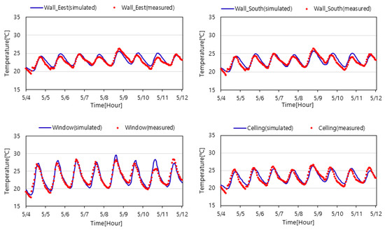 A simulation model of the test chamber is developed based on the geometry information from the experiment facility. The simulation model is created using the EnergyPlus [24] program, and its validity is checked by simulating the internal surface temperature under the same weather conditions as the measurement experiment. At this time, direct and diffuse components of solar radiation input to the simulation were determined using the Perez model [25], and parameter identification was performed using MCMC sampling to improve data simulation accuracy [26]. The simulated chamber internal surface temperature and R2 of the measured data showed good similarity to 0.8 or more. Figure 4 is a graph comparing simulation results and measured data for surface temperature.
