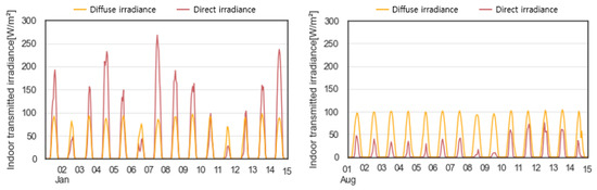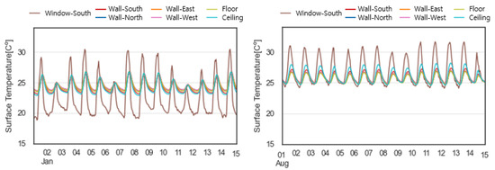 Figure 5 and Figure 6 show the simulation results under the set weather conditions. Figure 5 shows the indoor surface temperature, and Figure 6 shows the direct and diffusion components of irradiance transmitted into the room. The window’s surface temperature clearly indicates a large difference compared to other surfaces. Especially in January, it shows a big difference under the influence of irradiance and low outside temperature. The surface temperature of the ceiling in August is higher than that of other surfaces except for windows due to the influence of irradiance during the day. In the case of irradiance transmitted indoors, the diffuse irradiance transmitted indoors was slightly higher in August than in January. In contrast, the direct irradiance transferred indoors was much higher in January than in August due to the influence of the solar’s incident angle.