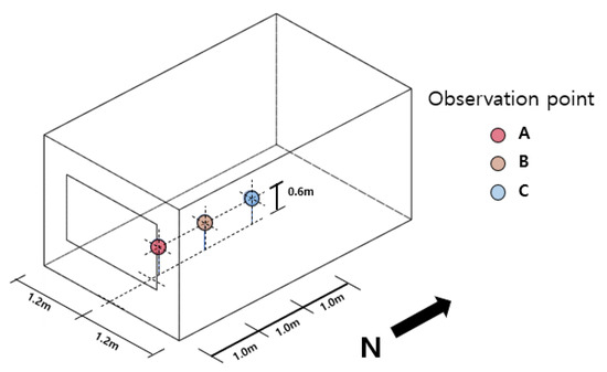 This section describes the mean radiant temperature and the PMV calculation procedure. To calculate these, the procedure presented in ISO7726 is mainly referred to, and since MRT may be affected by solar radiation transmitted through windows, the calculation method is modified by considering these effects [30]. In addition, these indicators are calculated for points with a distance of 1.0 m (A), 2.0 m (B), and 3.0 m (C) from the window to examine the trend according to the indoor location. The height of all points is 0.6 m, which is the height of the occupant’s sitting position [15]. Figure 7 is a schematic diagram of the location of the target points.