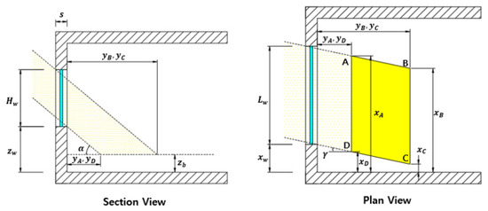 The area where the direct sunlight Is incident was calculated to confirm the shading effect [33]. This area is determined by the coordinates A, B, C and D points shown in Figure 8. These coordinates can be determined using the su’’s position and the geometric parameters of the envelope. (Equations (4)–(11)) When the target point is located within the calculated area, the shading coefficient is 1, otherwise, it is 0.