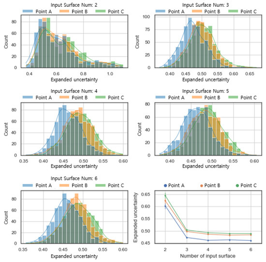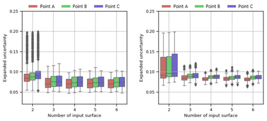 The uncertainty of was on average about 2.5% smaller than the uncertainty of . In the case of more than 5 surfaces, the uncertainty change by increasing the input surface was small, within ±1%. The newly added surfaces in and are surfaces classified from the surface group facing the adjacent zone. This indicates that the uncertainty change with the addition of the input surface is negligible because the surfaces facing the adjacent zone have similar temperatures.