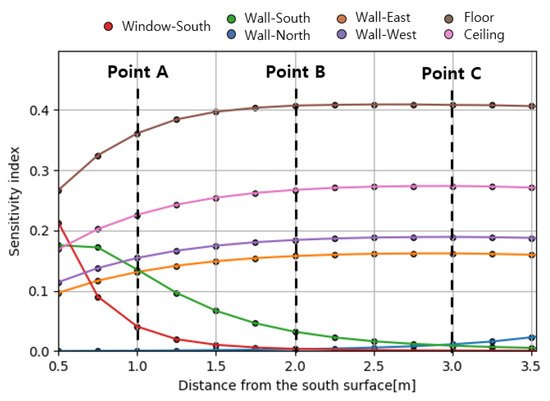 Figure 11 shows the sensitivity index of each surface to the MRT according to the distance from the south wall. As the distance increases, the sensitivity of the windows and the south wall decreases, and the sensitivity of other surfaces increases. It means that as the target point gets closer from A to C, the weight of the grouped surface increases so that the MRT uncertainty may increase. The increase was up to 0.1 °C in all cases.